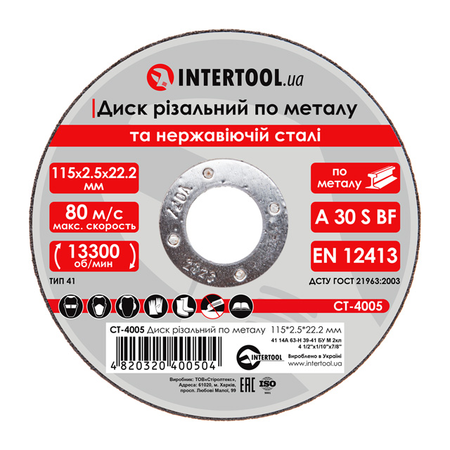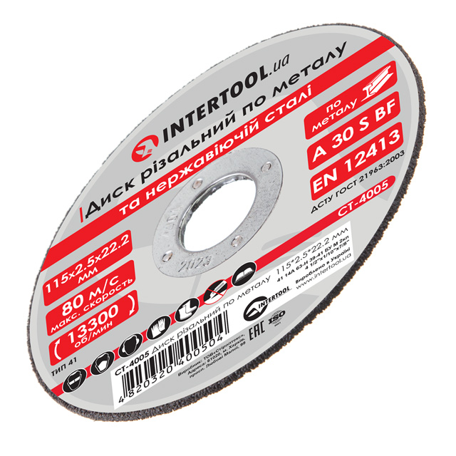 Характеристики Отрезной диск по металлу 115x2,5x22,2 мм INTERTOOL CT-4005 код товару CT-4005