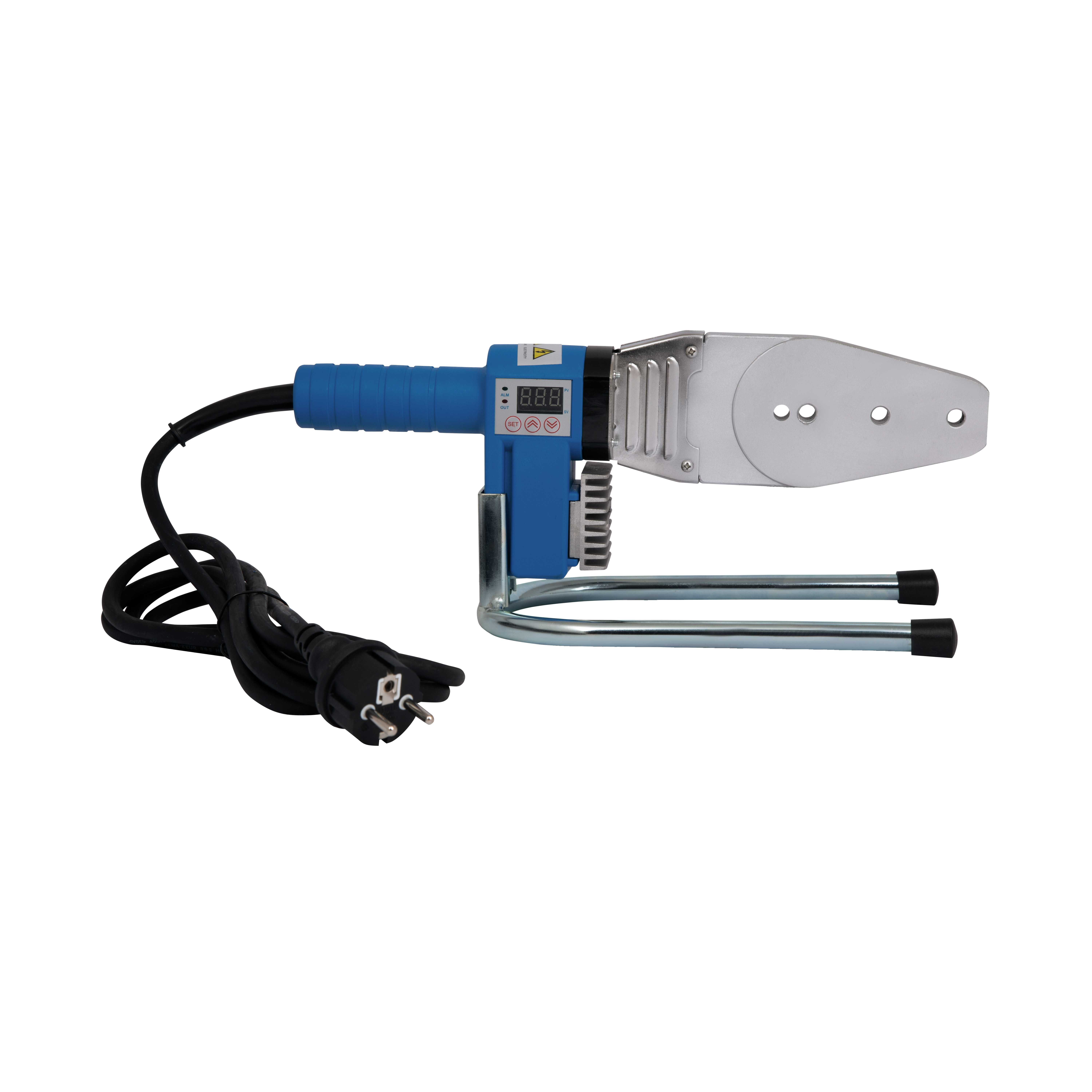 Паяльник Blue Ocean 20-63 с верхним цифровым дисплеем выполнен с удобной прорезиненной рукояткой и корпусом синего цвета, рогообразной подошвой с черными резиновыми насадками против скольжения во время работы и плоским нагревательным элементом с отверстиями для насадок. Прибор имеет мощность 1000 Вт, что позволит качественно и быстро спаять полипропиленовые трубы с наружным диаметром от 20 до 63 мм.