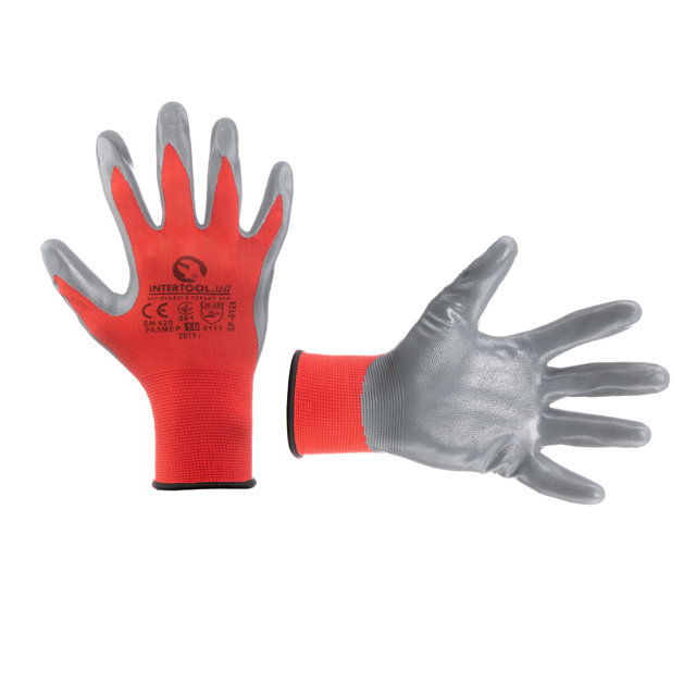 Характеристики Перчатка трикотажная синтетическая красная с серым нитрилом 10 INTERTOOL код товару SP-0124