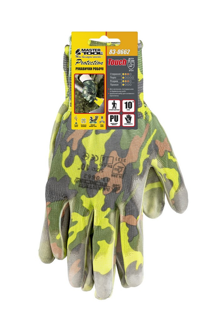 Характеристики Перчатки трикотажные бесшовные MASTERTOOL Камуфляж с полиуретаном код товару 83-0662