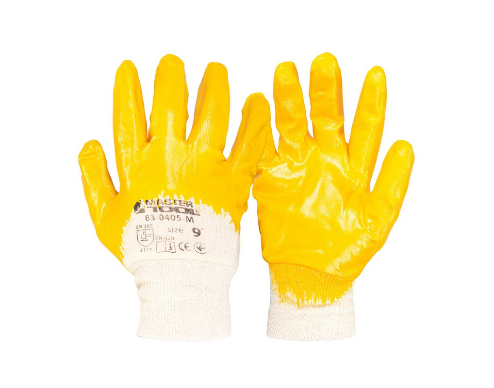 Характеристики Перчатки хлопчатобумажные трикотажные MASTERTOOL нитриловое покрытие ¾ вязаный манжет 8" оранжевые 83-0405-M код товару 83-0405-M