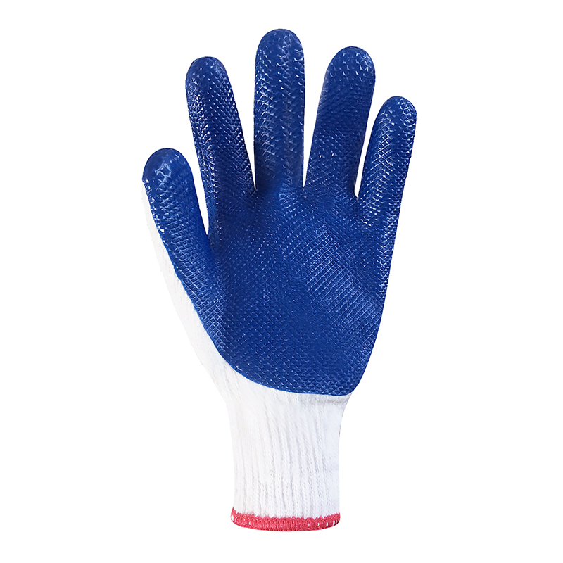 Материал: - основа: хлопок; - покрытие: латекс вулконизований; Особенности: - Цвет основы: белый; - покрытие: синее; - размер: 10; - вес пары: 100 г. Количество в упаковке 12 пар Вес упаковки 1,200 кг. Групповых упаковка - мешок Количество пар в групповом упаковке - 360 пар.