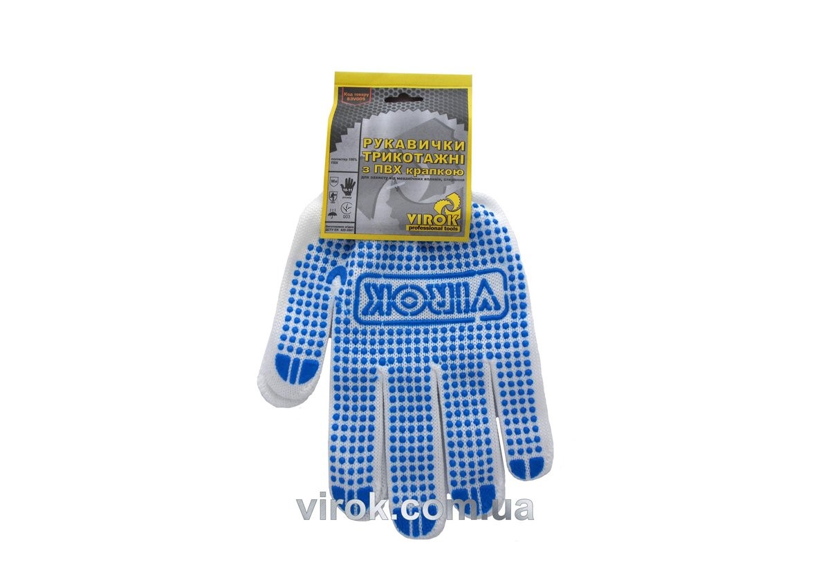 Описание Рукавицы трикотажные VIROK белые с ПВХ точкой, 5 ниток, 100% полиэстер, размер 10 код товару 83V005