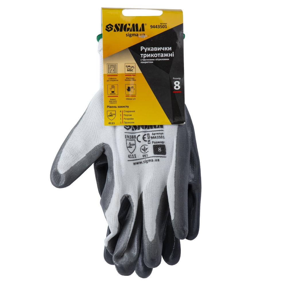 Перчатки трикотажные с нитриловым покрытием SIGMA р8, серые манжеты код товару 9443501 Sigma
