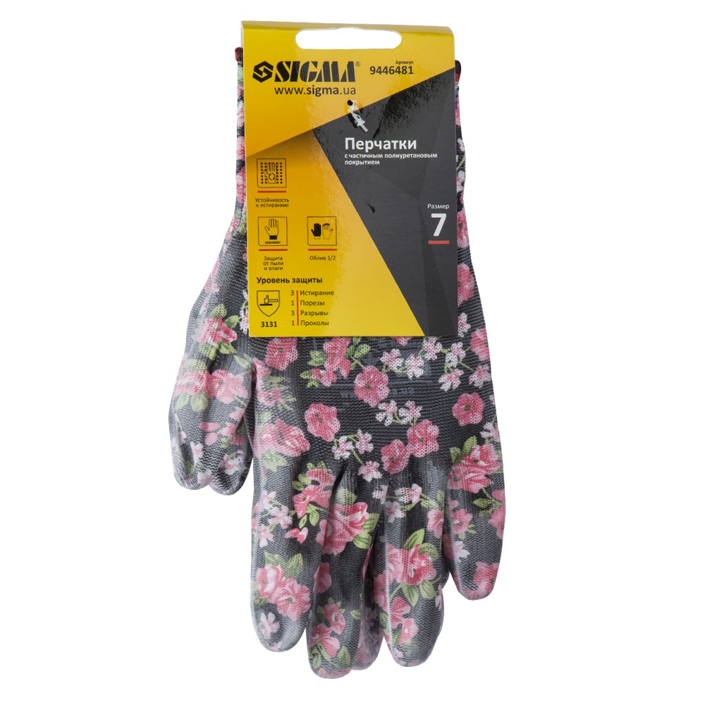 Характеристики Перчатки трикотажные с частичным ПУ покрытием р7 черные манжет SIGMA код товару 10173