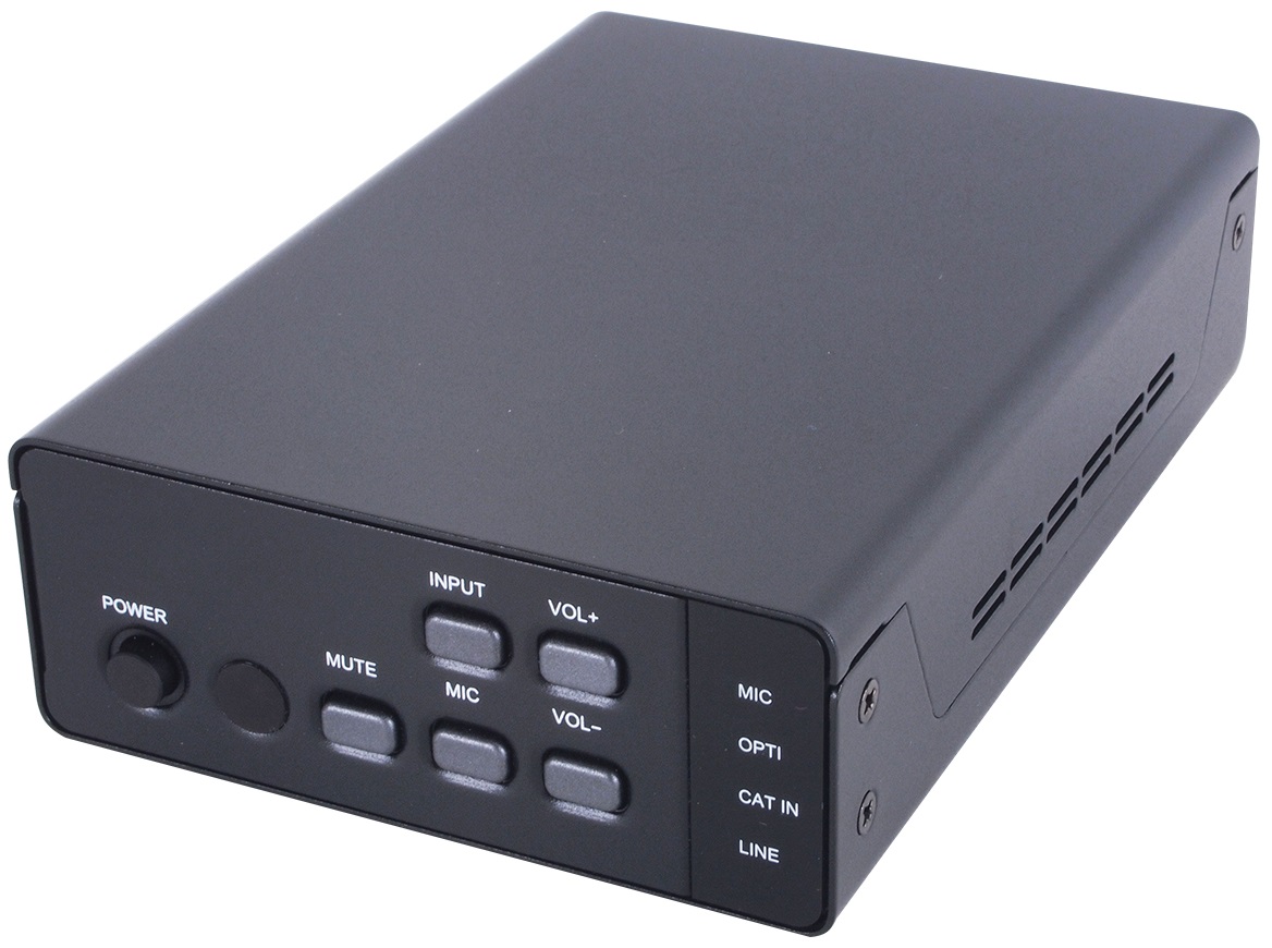 Підсилювач з оптичним/LR/CAT входом, мікшуванням і мікрофоном - це чудовий пристрій для мікшування аудіо з вокалом і виведення на аналоговий динамік з моно або стереозвуком. Дозволяє користувачеві вибирати як цифрове, так і аналогове джерело звуку, а також передавати звук на відстань до 300 метрів.