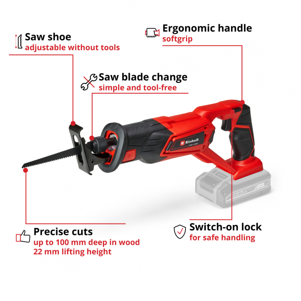 Акумуляторна шабельна пила Einhell TE-AP 18/22 Li Kit є пристроєм сімейства Einhell Power X-Change. Акумулятор і зарядний пристрій Power X-Change можуть використовуватися для всіх пристроїв сімейства Power X-Change. Зміна пильного полотна без використання додаткового інструменту дозволяє економити цінний час. Підошву також можна відрегулювати без застосування інструментів.