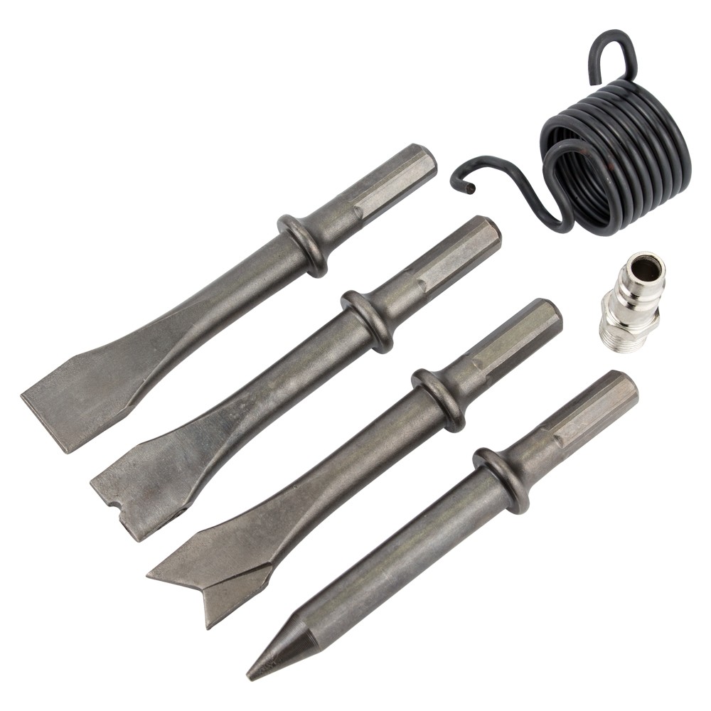 Зубило с набором насадок пневматическое Sigma (6835111) идеально подходит для выполнения несложных зачистных работ, например, для отбивания плитки и штукатурки, а также для других видов работ. Облегченный корпус из высокопрочного технополимера обеспечивает долгий срок службы.