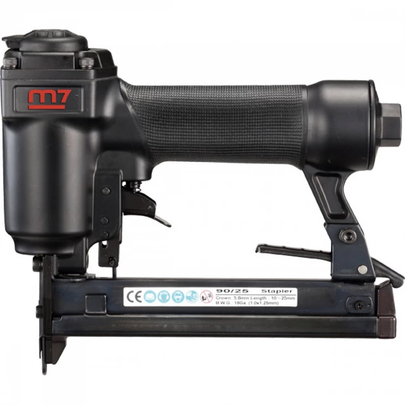 Пневмостеплер Mighty Seven SU-8016 - пневмоінструмент для скріплення різних матеріалів за допомогою металевих скоб. Представлена модель відноситься до професійного обладнання, працює на стислому повітрі, який подається від компресора. Здатний працювати з м'якими породами деревини, ДВП, фанерою, ДСП, гіпсокартоном та іншими будівельними матеріалами.
