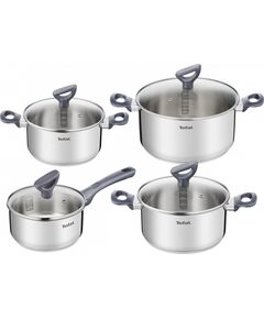 БрендTefal Возможность мыть в посудомоечной машине1 Количество предметов11 Крепление ручекГвинтове з'єднання МатериалНержавіюча сталь Материал ручекБакеліт Особенности посудыМірна шкала, індикатор нагрівання Совместимость с источниками теплаВсі види плит Страна производительКитай ТипЗмішаний набір У наборі входятьКовш, кухонні аксесуари, сковорода 28 см, каструля з кришкою 20 см, каструля з кришкою 24 см ЦветСріблястий