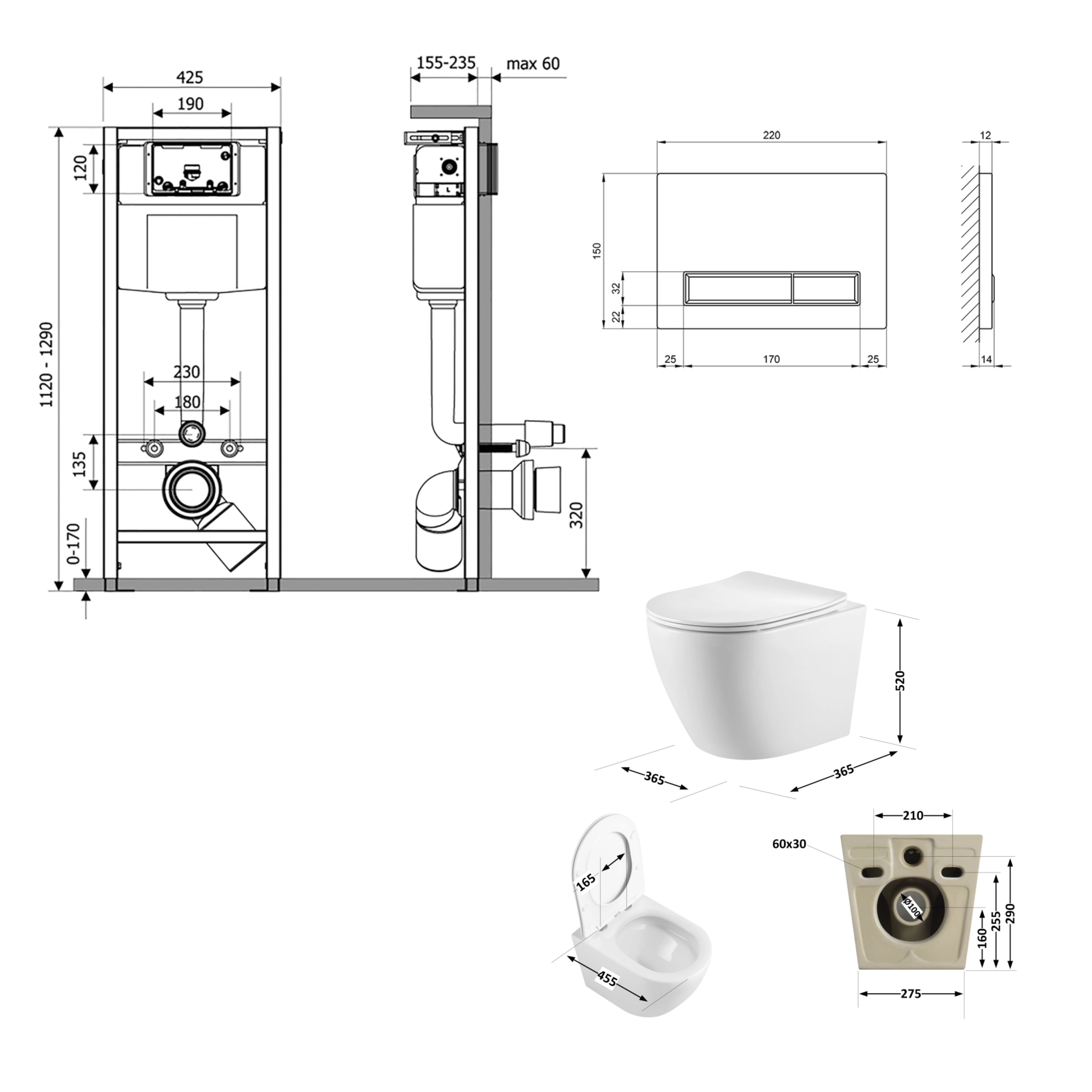 - 365х520х365 - унитаз; 425х185х1280 - инсталляция; 220х13х150 - панель смыва