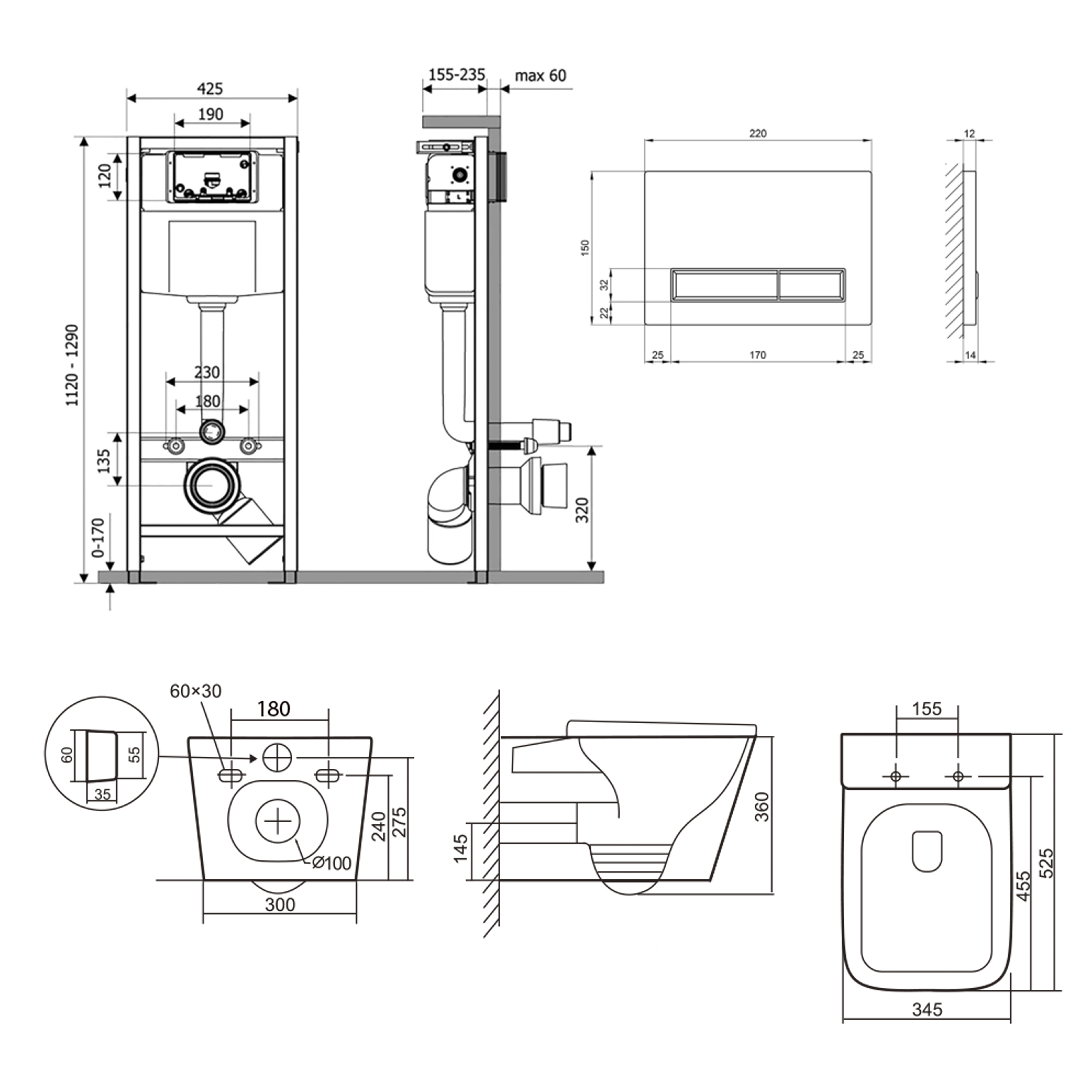 - 345х525х360 - унитаз; 425х185х1280 - инсталляция; 220х13х150 - панель смыва