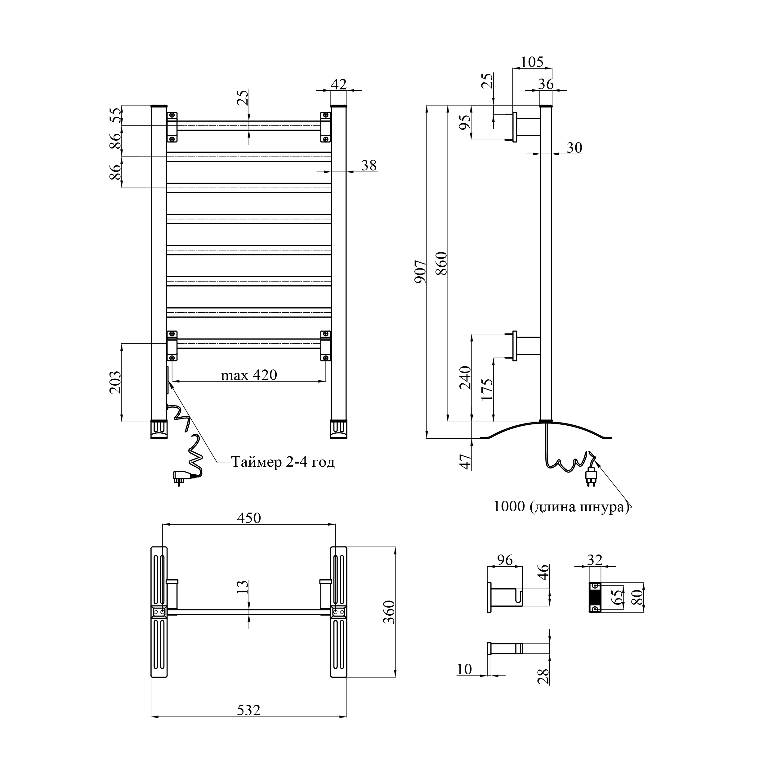 Модель оснащена 8 нагревательными секциями, которые обеспечивают равномерное тепло и быстрое высушивание полотенец. Встроенный таймер на 2 и 4 часа позволяет настроить время работы, а максимальная температура нагрева до 50°C делает использование безопасным и энергоэффективным.