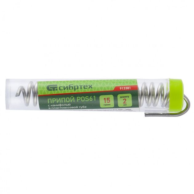 Характеристики Припой с канифолью, D 2 мм, 15 г, в тубе СИБРТЕХ код товару 913381C