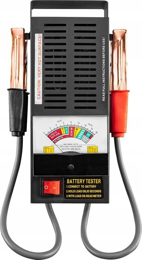 - Не вимагає джерела живлення, дозволяє перевірити продуктивність акумулятора під навантаженням, дозволяє оцінити ступінь зарядки та зносу, розроблений для свинцево-кислотних акумуляторів, з аналоговим дисплеєм