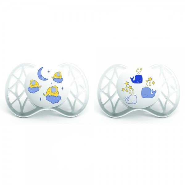 Набір двох пустушок з симпатичним дизайном. Пустушки симетричні, ортодонтичні і до того ж світяться у темряві. Педіатри рекомендують використовувати пустушку для немовлят. Такий атрибут заспокоює дитину, забезпечує заспокійливу і розслабляючу дію для дитини, сприяє правильному розвитку піднебіння, ротової порожнини. Пустушка Nuvita з інноваційною формою та матеріалом адаптована до віку дитини та її природніх потреб. Виріб можна стерилізувати. Для дітей від народження.