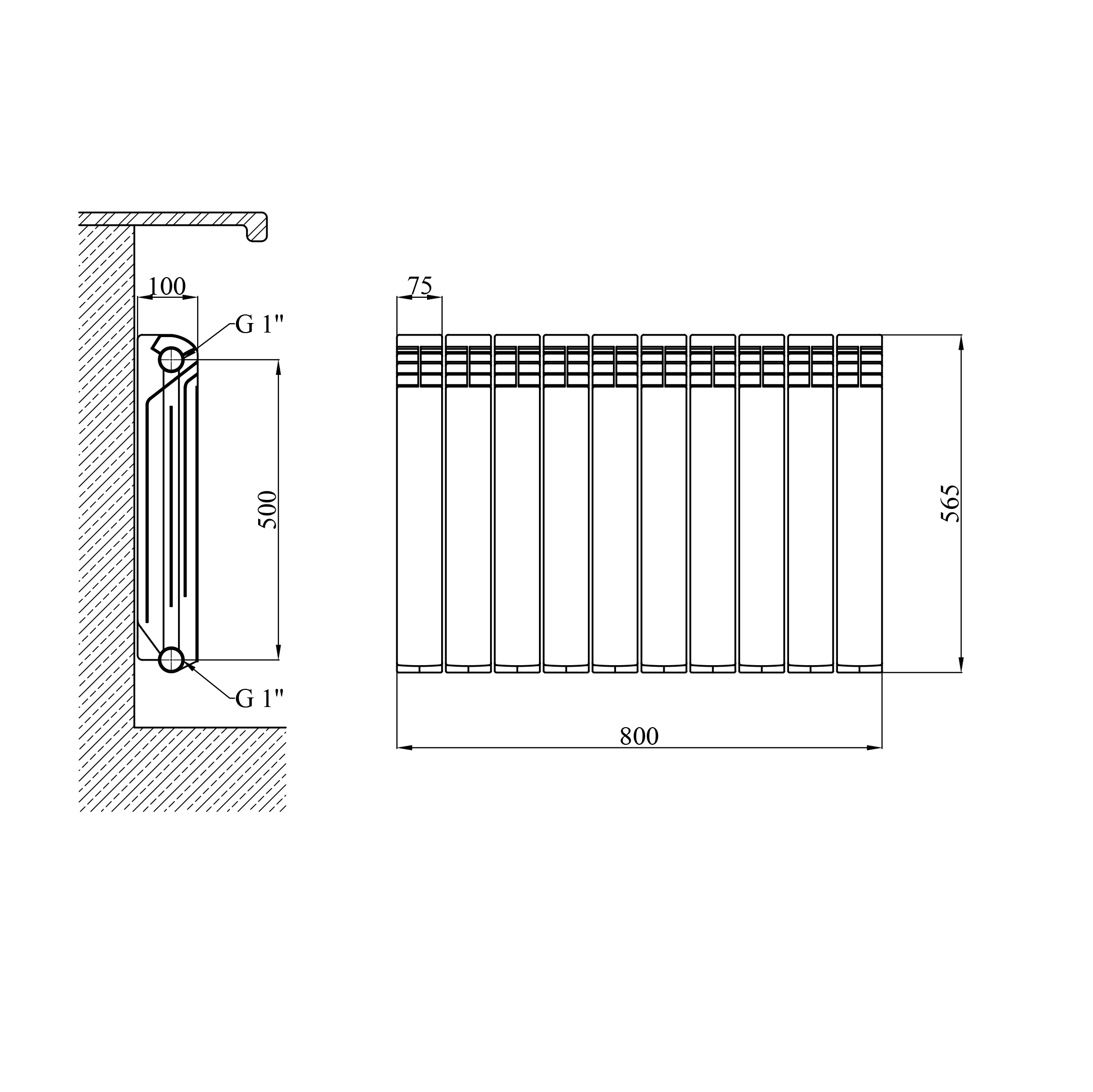 Монтаж радиатора выполняется на стену, а подключение осуществляется с боковой стороны с помощью резьбы диаметром 1". Межосевое расстояние подключения составляет 500 мм, что является стандартом для большинства установок. Радиатор использует воду в качестве теплоносителя, и рекомендуемый водородный показатель для эффективной работы находится в пределах от 5 до 8 рН.