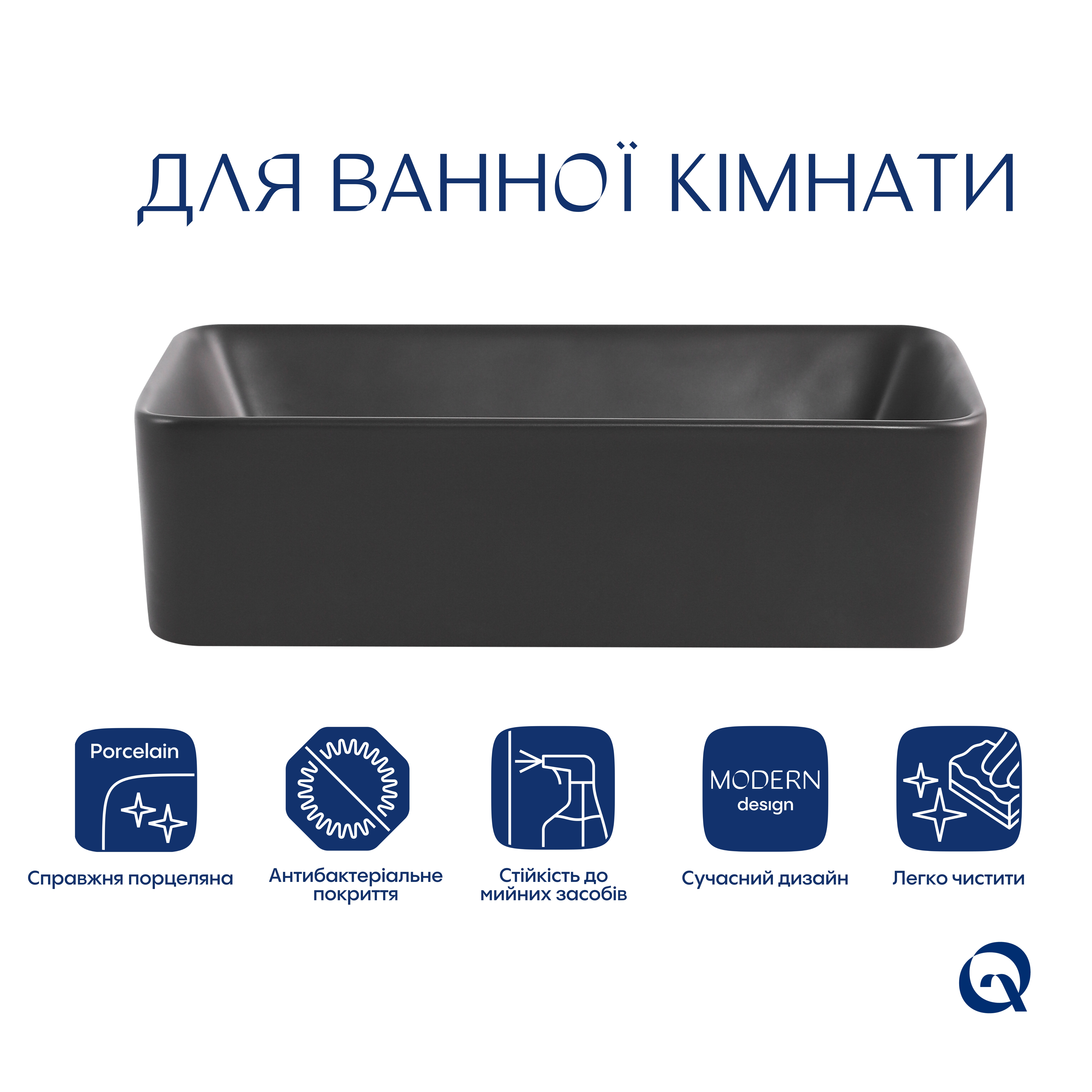 Описание Раковина накладная Qtap Tern 480x370x135 мм, Anthracite, прямоугольная, с донным клапаном QT17116069AN код товару SD00054300