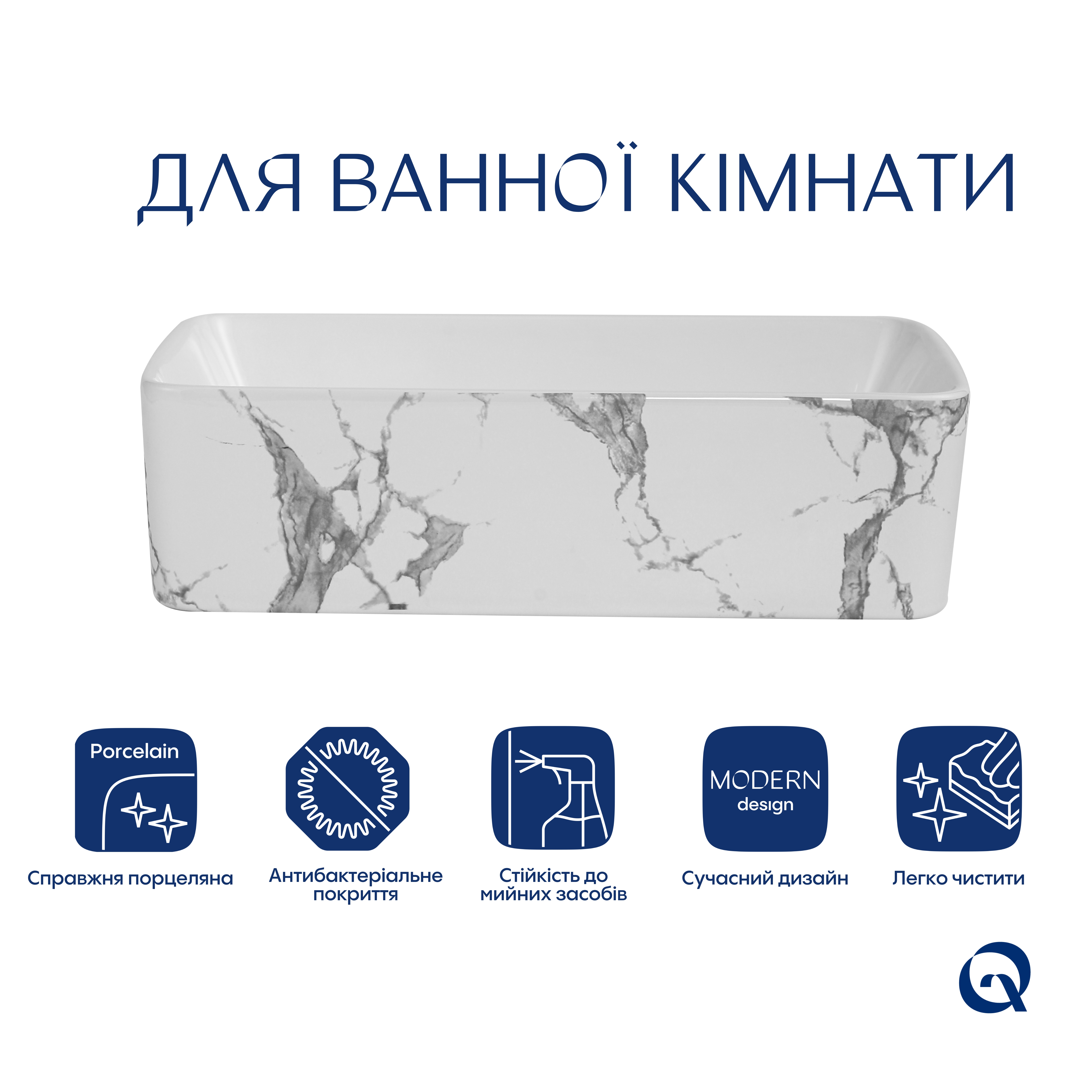 Характеристики Раковина накладная Qtap Tern 480x370x135 мм, Marble, прямоугольная, с донным клапаном QT17116069MR код товару SD00054303