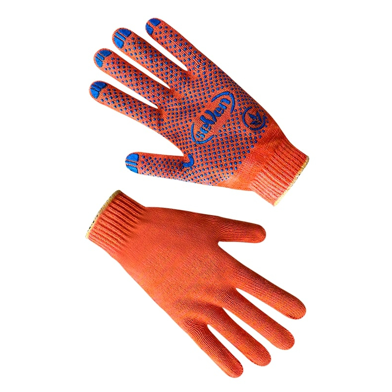 Захисні рукавички, виготовлені із високоякісної бавовни та поліестеру, які мають ПВХ-крапкове покриття на долонній частині. Манжет у вигляді резинки надійно фіксує рукавичку на руці. Край манжету оброблений оверлоком. Рукавиці мають високу міцність та стійкі до стирання.