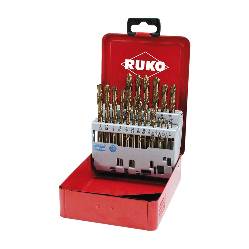 Описание RUKO Набор спиральных сверл DIN 338 тип VA, HSSE-Co 5 дробных размеров в стальном корпусе - 21 шт. код товару 215