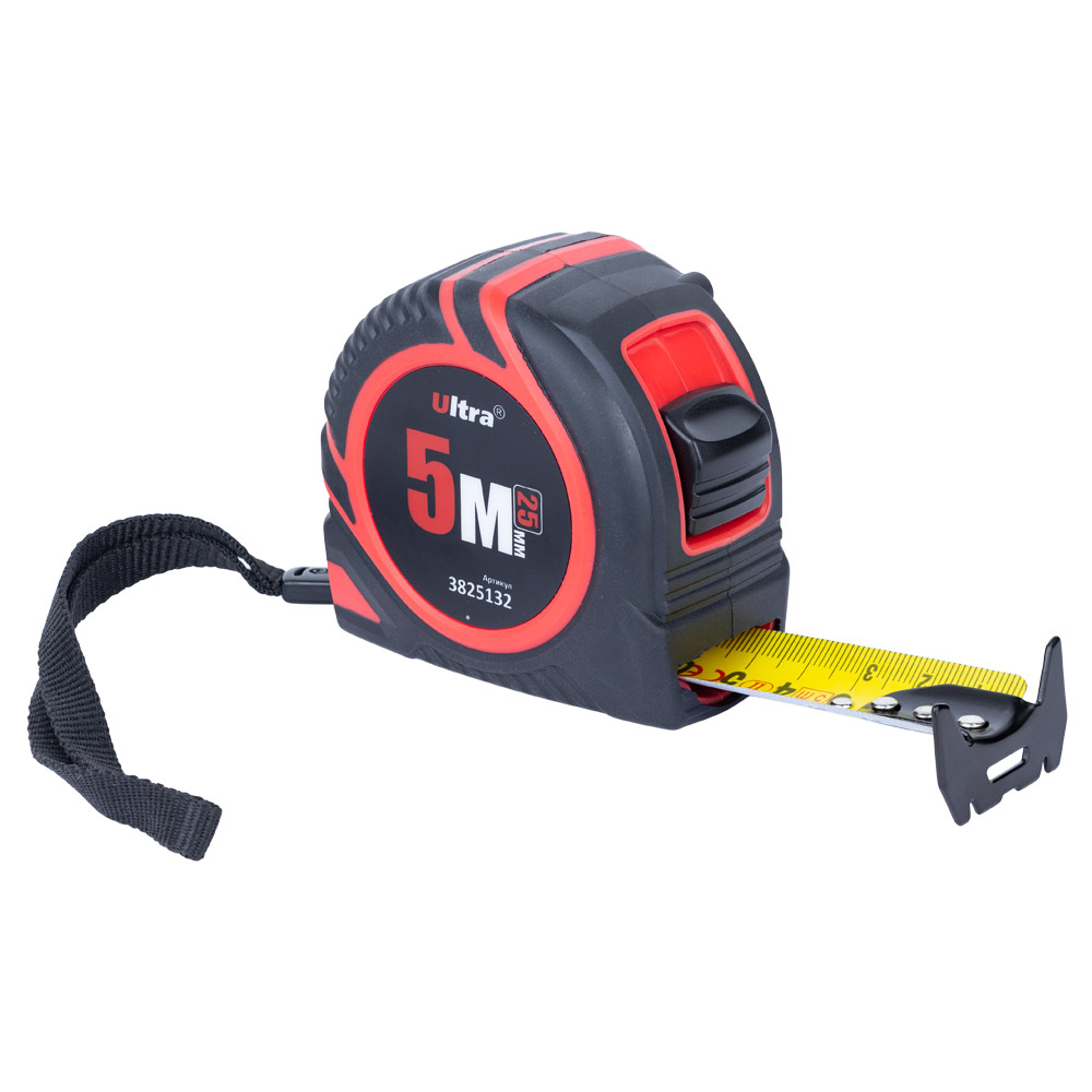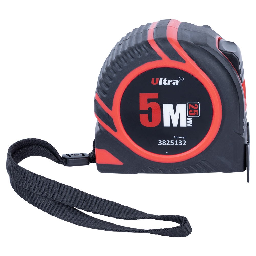 Рулетка нейлоновая ULTRA 5м*25мм с обрезиненным корпусом. Удобная, прочная и гибкая, идеально подходит для точных измерений в строительстве и ремонте. Легкий доступ к шкале.