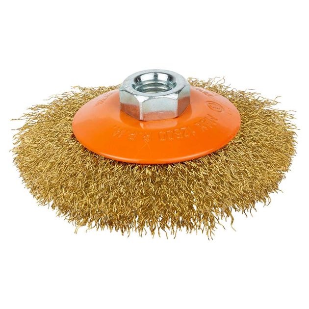 Характеристики Щетка проволочная конусная 100мм М14*2мм GRAD (латунированная) код товару 9035105