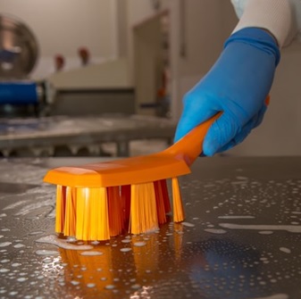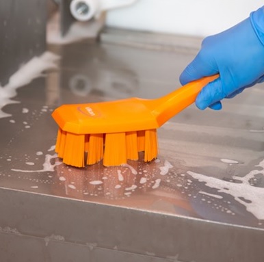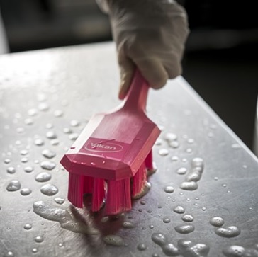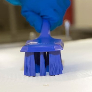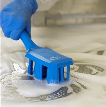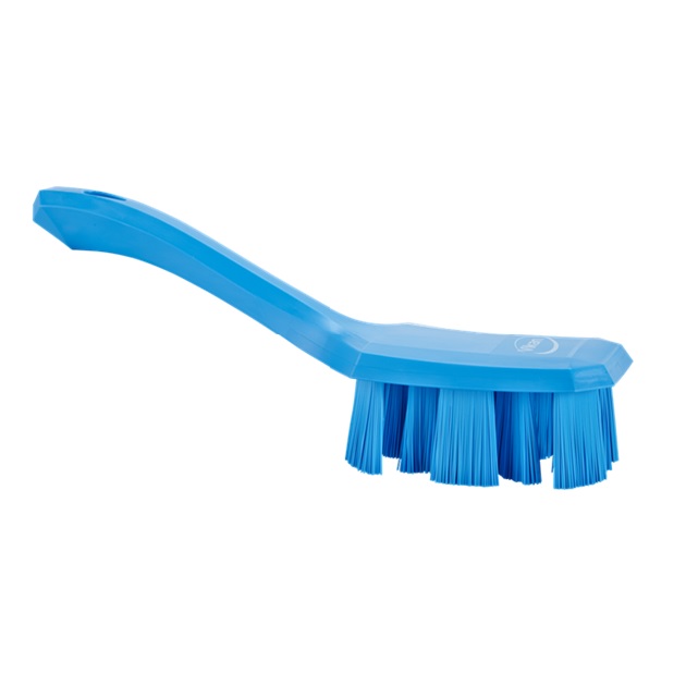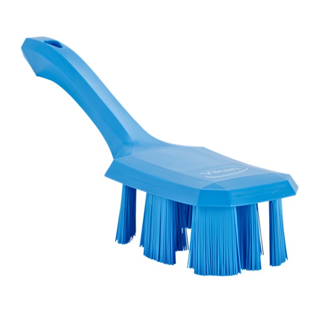 Щетка с короткой ручкой и жестким ультрагигиеничным ворсом UST. Повышенная прочность ворса обеспечивает высокое качество очистки конвейерных лент, станков и другого оборудования, а также столов для подготовки продуктов, где высок риск загрязнения. Все щетки UST имеют особый рисунок ворса, который минимизирует риск выпадения и попадания ворсинок в пищу.