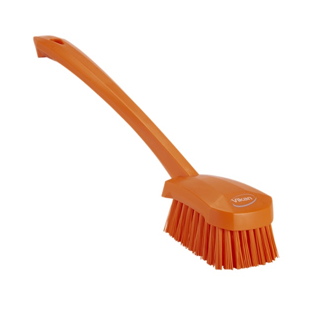 Довга ручка цієї щітки дозволяє дістатися до самих важкодоступних ділянок обладнання. Розташований під кутом ворс середньої жорсткості добре миє глибокі відра, контейнери, бочки тощо