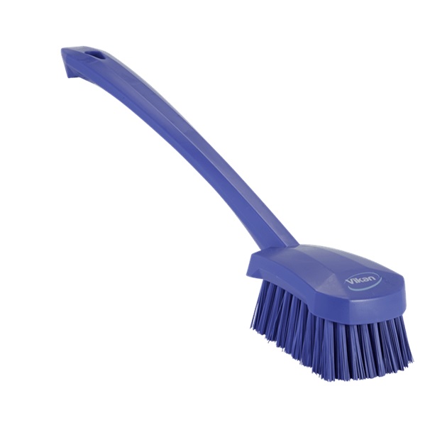 Довга ручка цієї щітки дозволяє дістатися до самих важкодоступних ділянок обладнання. Розташований під кутом ворс середньої жорсткості добре миє глибокі відра, контейнери, бочки тощо