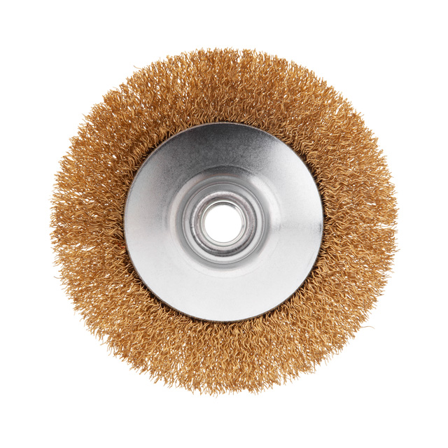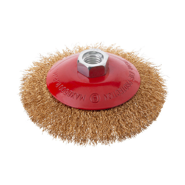 Характеристики Щітка конусна, 115 мм, M14, кручений дріт покритий латунню, для КШМ, 12500 об/хв код товару BT-5116