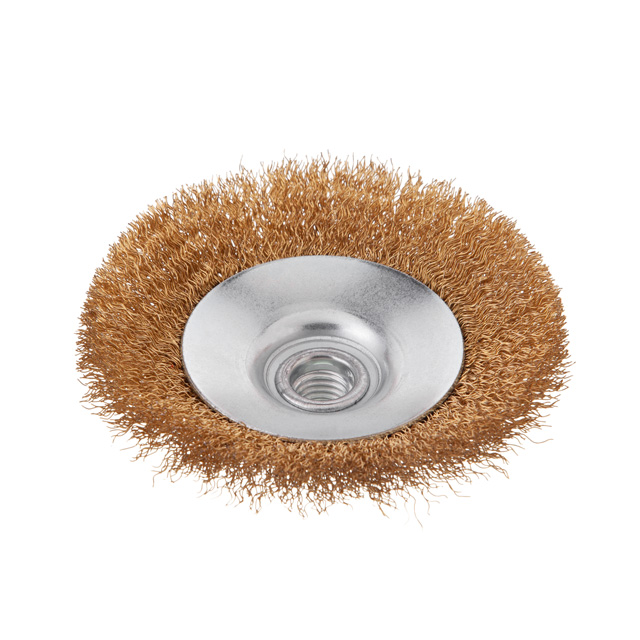 Описание Щітка конусна, 115 мм, M14, кручений дріт покритий латунню, для КШМ, 12500 об/хв код товару BT-5116
