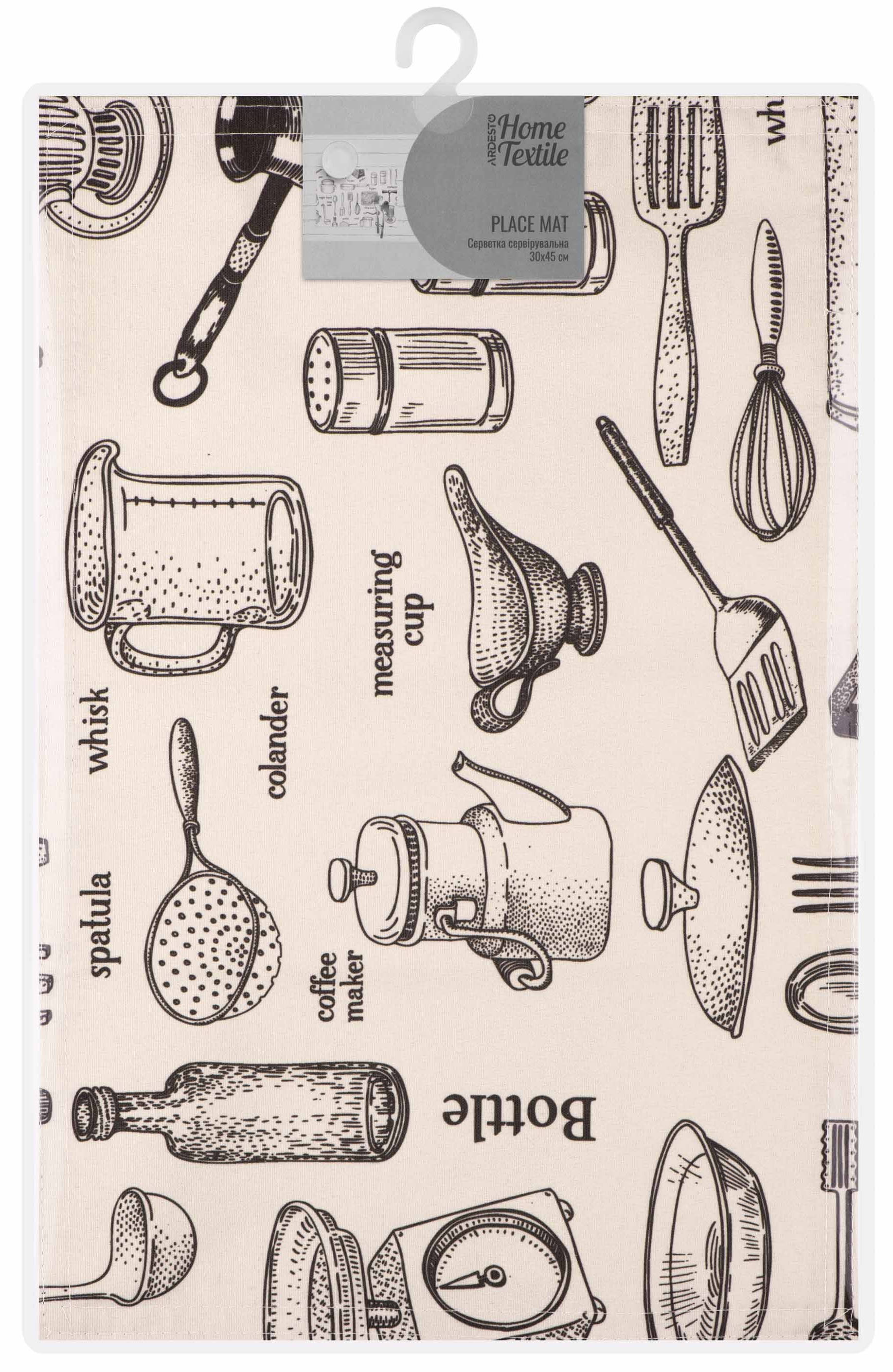 Сервірувальна серветка – це не лише засіб для збереження чистоти, але й елемент декору, який допоможе створити особливу атмосферу на столі. Розмір виробу у дизайні Kitchen становить 30 × 45 см. Виготовлено серветку з поліестеру (90 %) і бавовни (10 %), забезпечуючи тривалий термін слугування. Збереження властивостей виробу гарантує дотримання таких правил догляду: прання в пральній машині за 30 °C на делікатному режимі; сушіння в машині за низької температури; заборона відбілювання; заборона чищення будь-яким розчинником, крім трихлоретилену; прасування за температури до 110 °C.