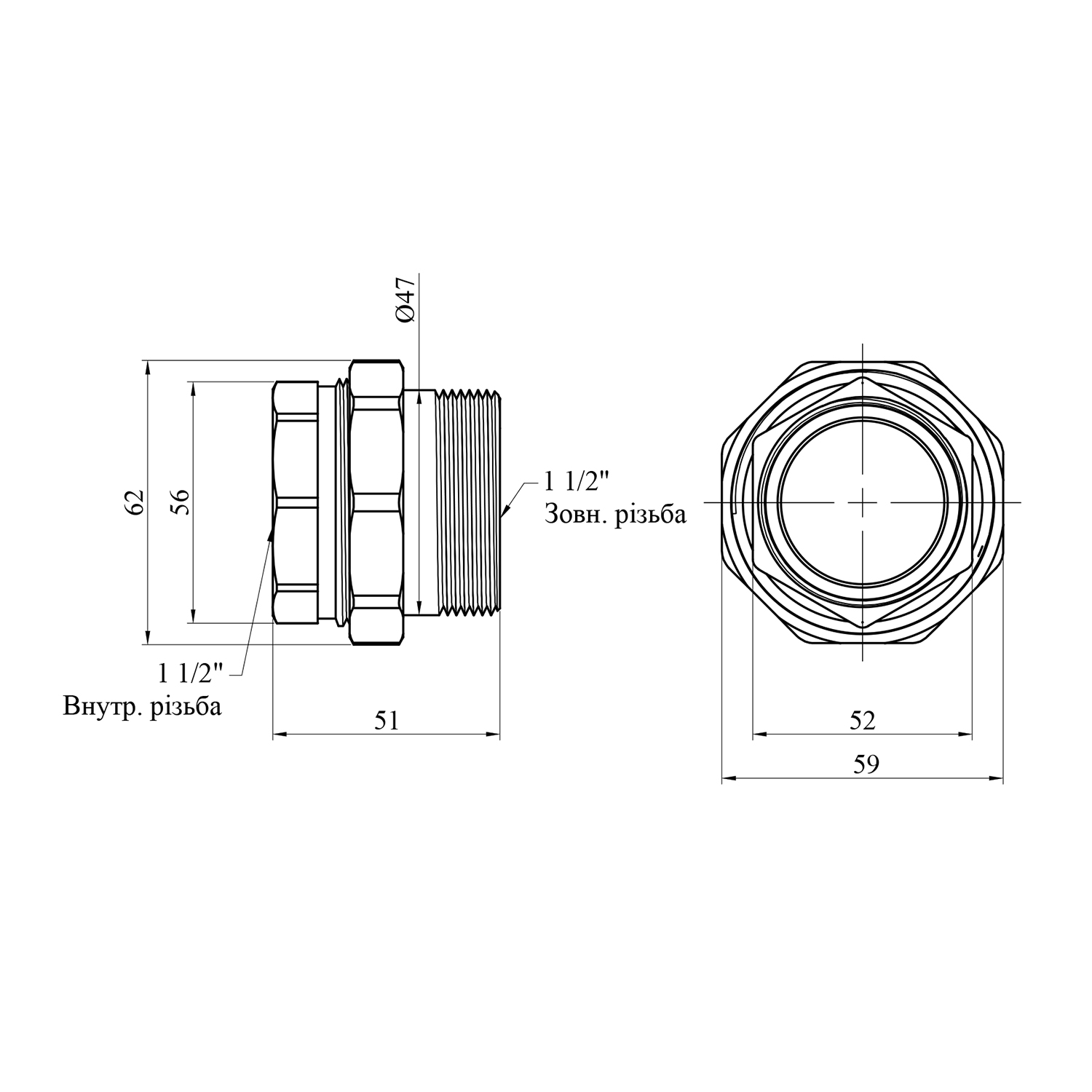 Характеристики Сгон-американка прямая STA 1 1/2" ВН латунная код товару CV012456