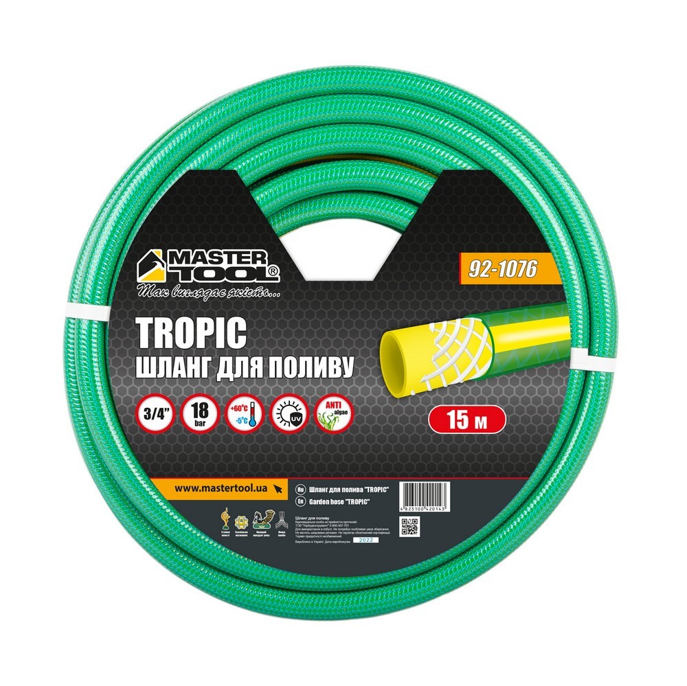 Характеристики Шланг для полива MASTERTOOL TROPIC 3/4", 15 м, зеленый код товару 92-1076