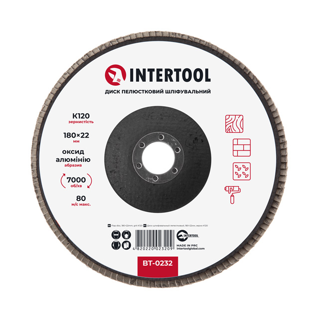 Характеристики Шлифовальный диск лепестковый 180x22 мм, K120 INTERTOOL BT-0232 код товару BT-0232