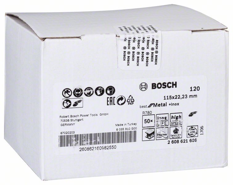 Описание Шлифовальный круг R780, Best for Metal + Inox 115x22,23 мм, G120 BOSCH код товару 2608621609