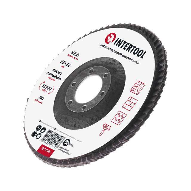 Характеристики Шлифовальный лепестковый диск 115x22 мм, зерно K150 INTERTOOL код товару BT-0115