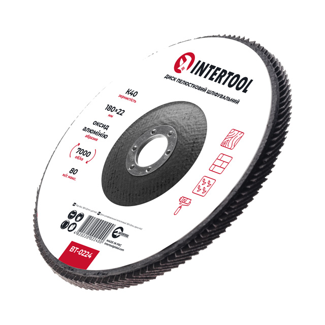 Характеристики Шлифовальный лепестковый диск 180x22 мм, зерно K40 INTERTOOL код товару BT-0224