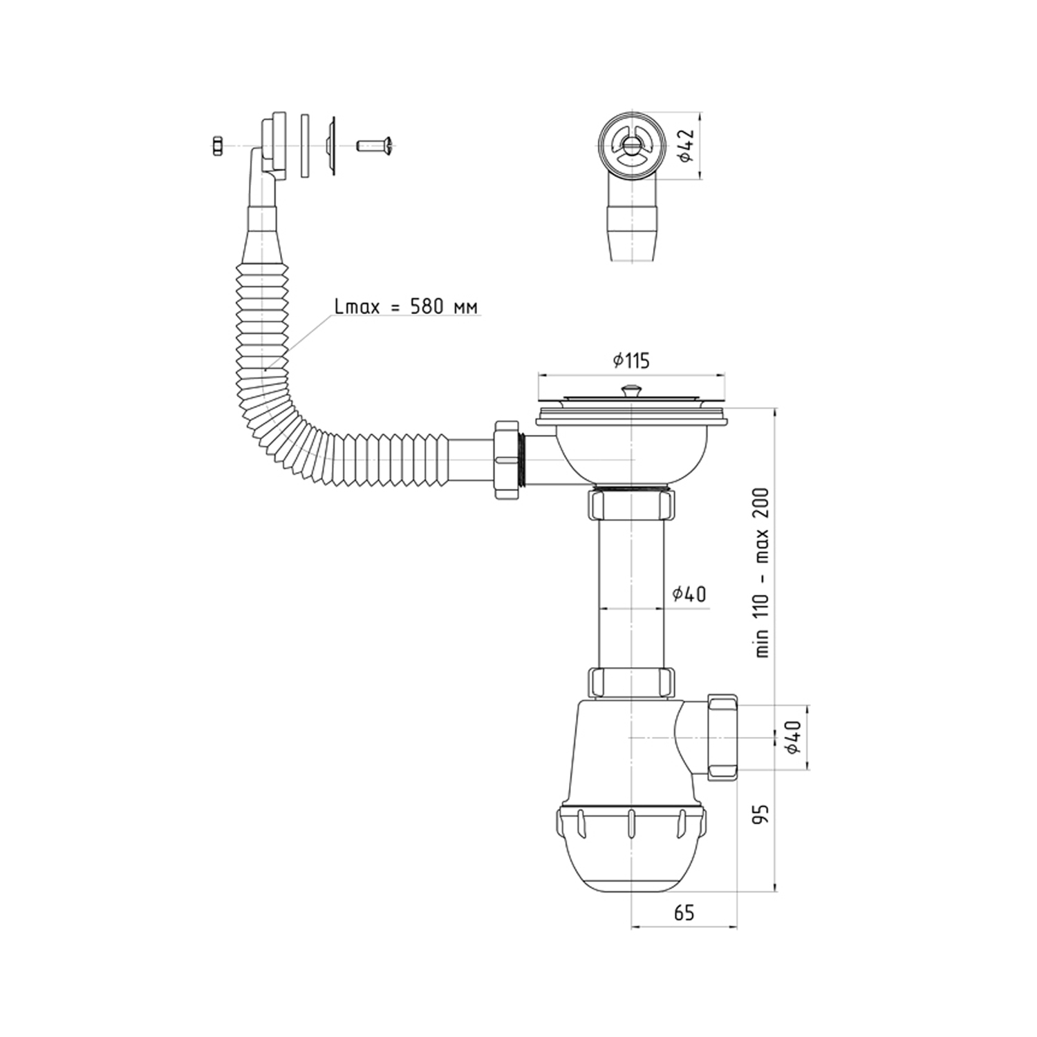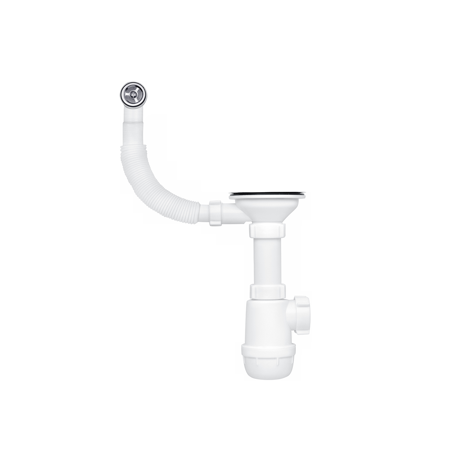 Сифон, резьбовой выпуск, гибкий круглый перелив, нержавеющая сетка
