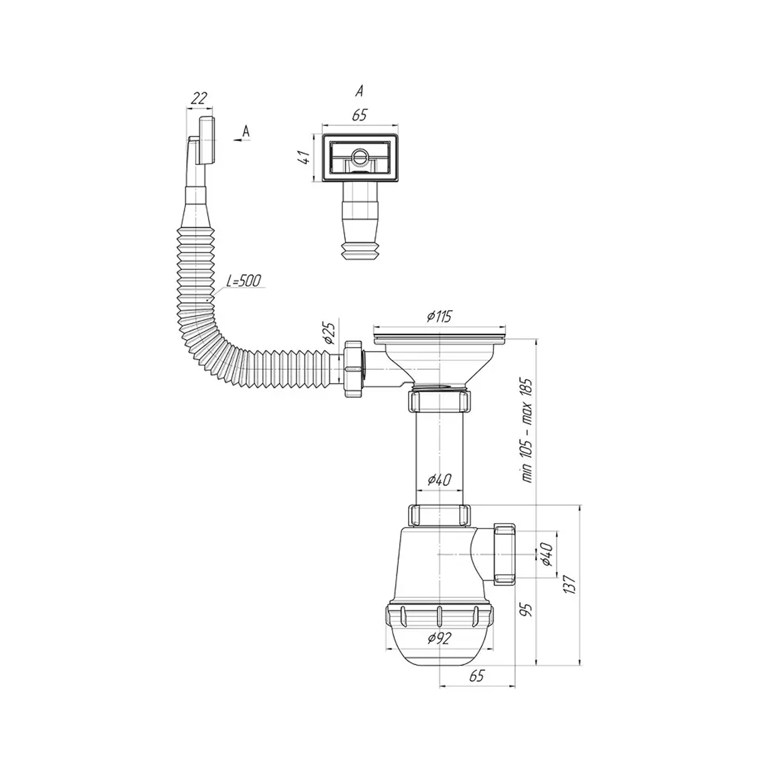 Сифон, резьбовой выпуск, гибкий перелив, нержавеющая сетка