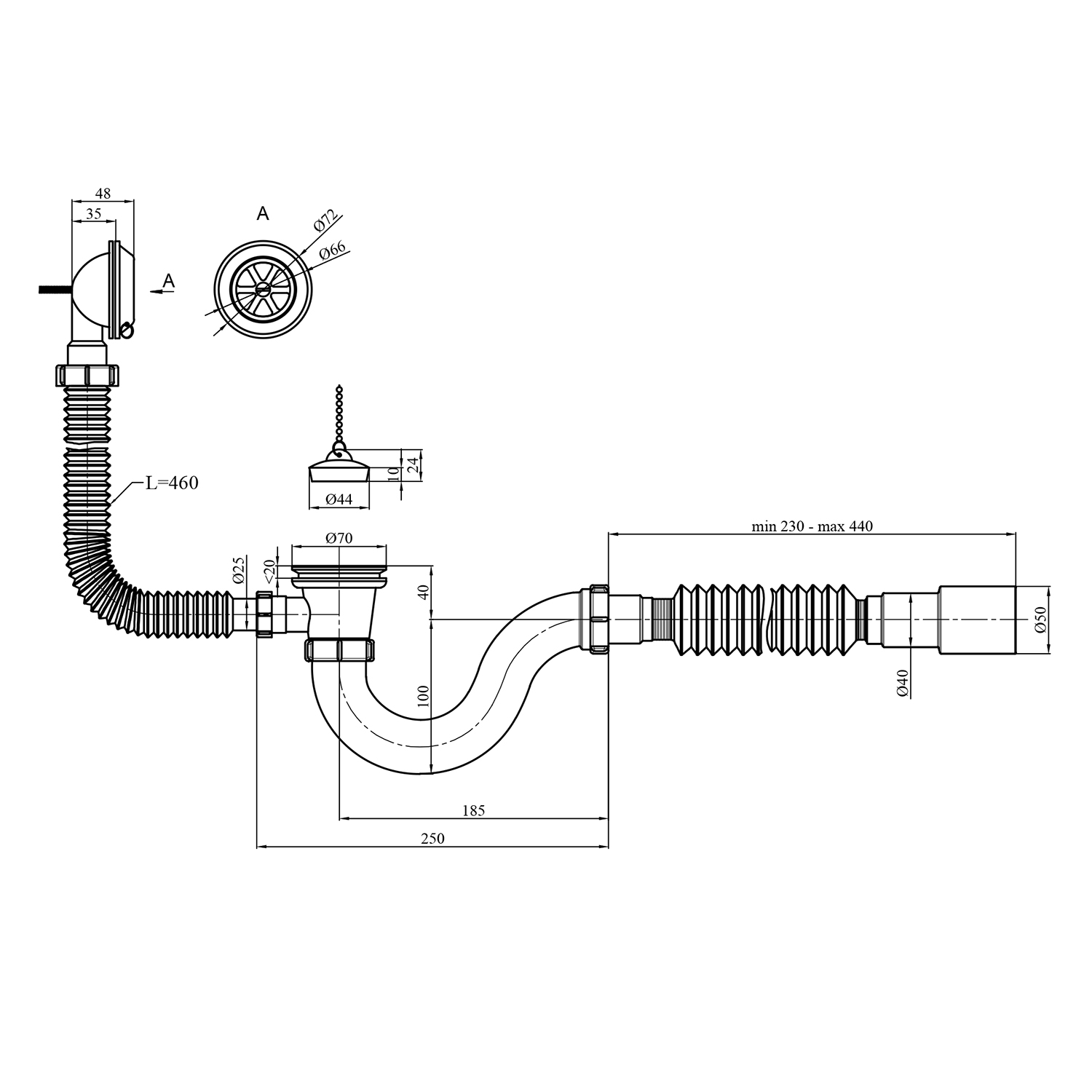 Сифон, резьбовой выпуск, гибкий круглый перелив, нержавеющая сетка