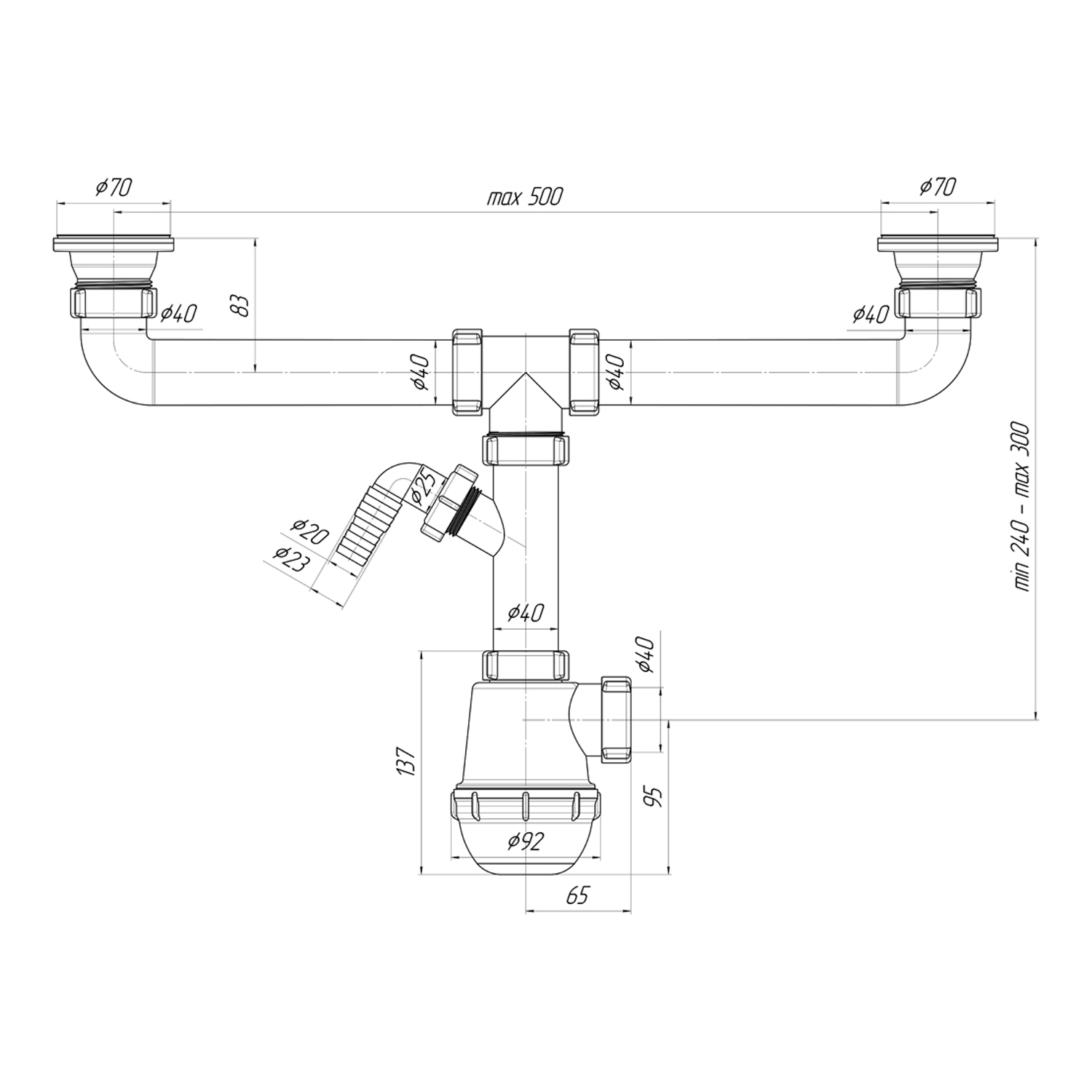 Характеристики Сифон двойной для кухонной мойки ANIplast, выпуск 70 мм, выход 50 мм код товару CV019477