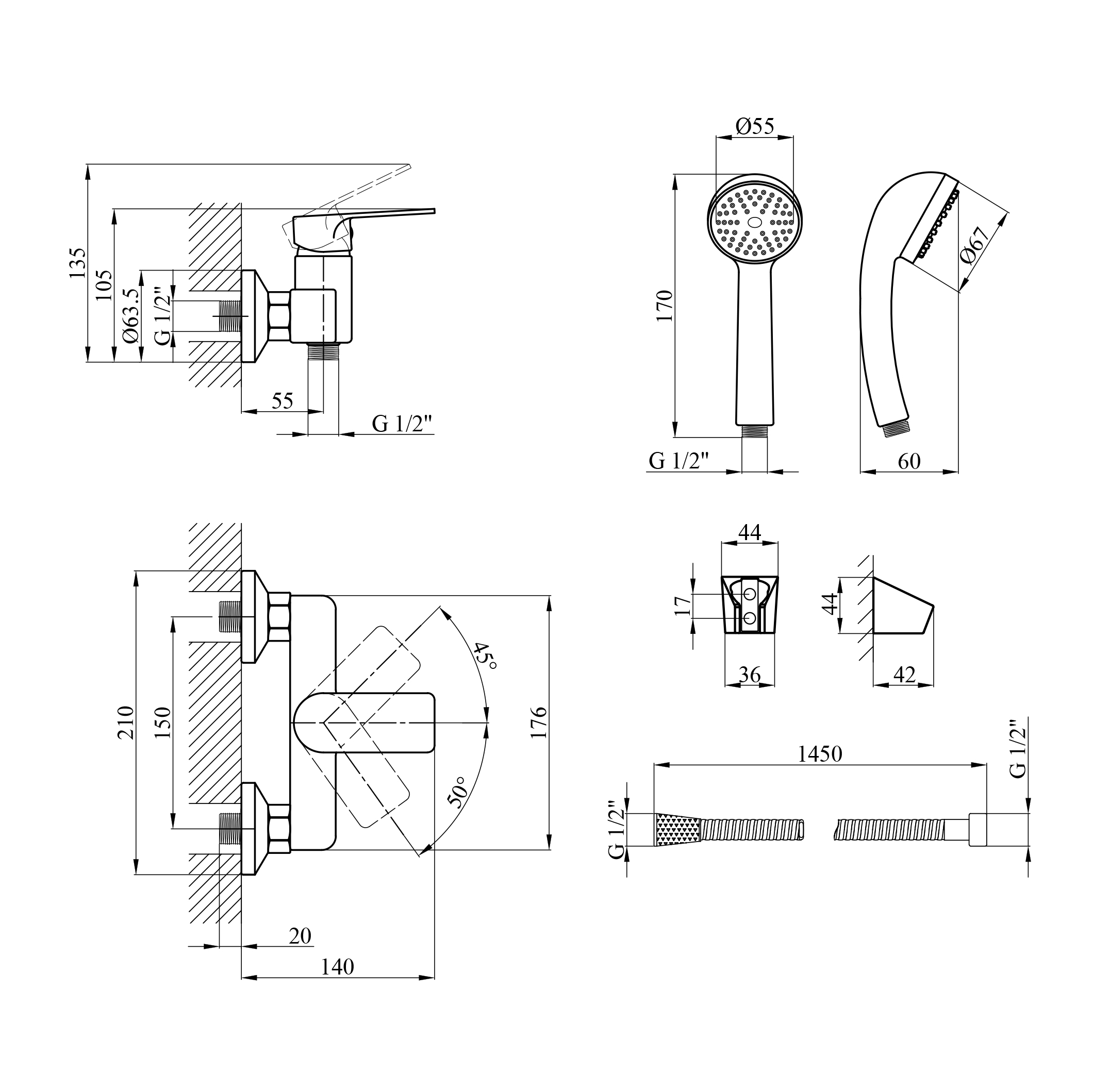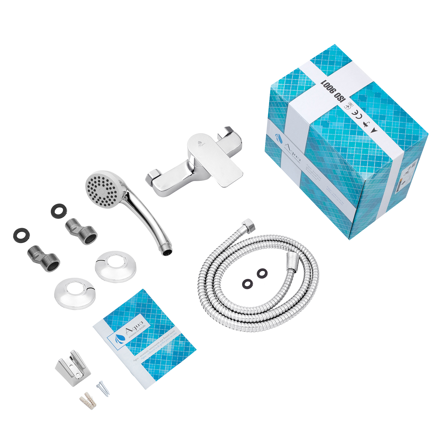 Смеситель, лейка для ручного душа, душевой шланг, кронштейн для ручного душа, крепежи, инструкция.