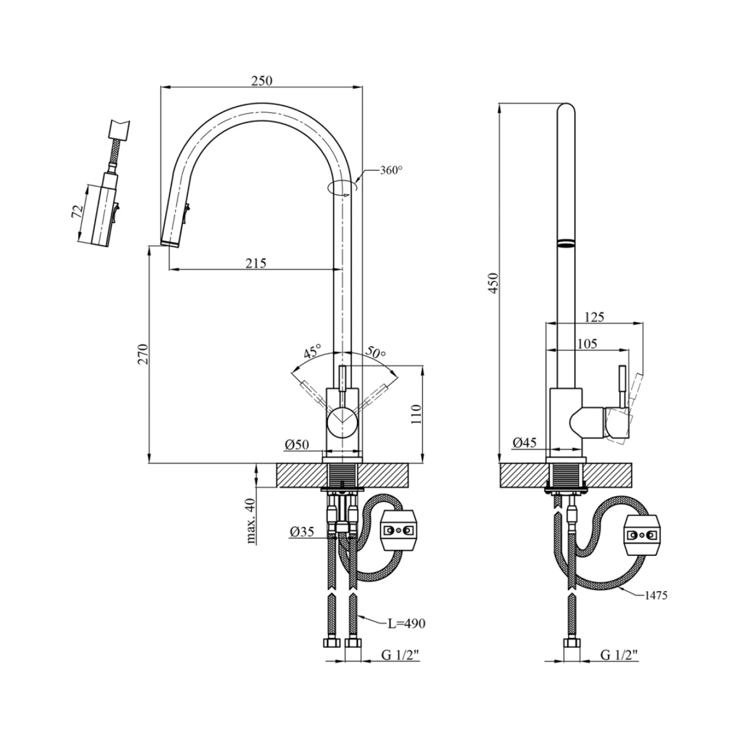 Описание Смеситель кухонный с выдвижным изливом Kroner KRP Edelstahl код товару CV032281