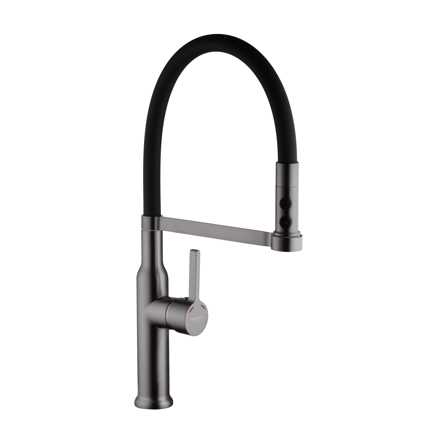 Корпус изготовлен из высококачественной латуни с матовым графитовым покрытием, которое придает смесителю элегантный вид и защищает его от коррозии. Гибкий силиконовый излив черного цвета, добавляет современный акцент и повышает комфорт в ежедневном использовании. Важной особенностью является держатель, который фиксирует излив: он может работать как в зафиксированном положении, так и свободно маневрировать, что делает смеситель чрезвычайно удобным в эксплуатации.