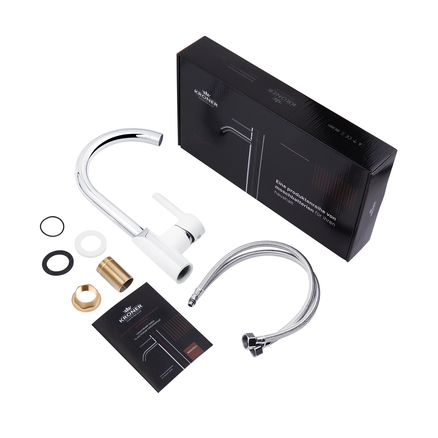 Смеситель Kroner KRP Essen W030 — это идеальный выбор для вашей кухни. Он сочетает в себе функциональность и стиль. Латунный корпус, хромированное покрытие, однорычажный механизм — все это делает его надежным и удобным в использовании. Поворот на 360 градусов позволяет легко наполнять большие кастрюли. А встроенный аэратор помогает экономить воду. Установка не займет много времени, а современный дизайн впишется в любой интерьер. Выбор, который не разочарует!