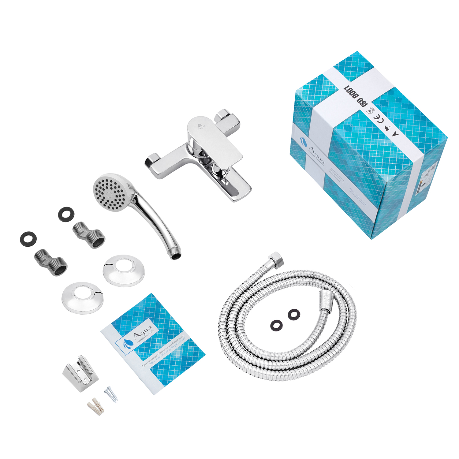 Смеситель, лейка для ручного душа, душевой шланг, кронштейн для ручного душа, крепежи, инструкция.