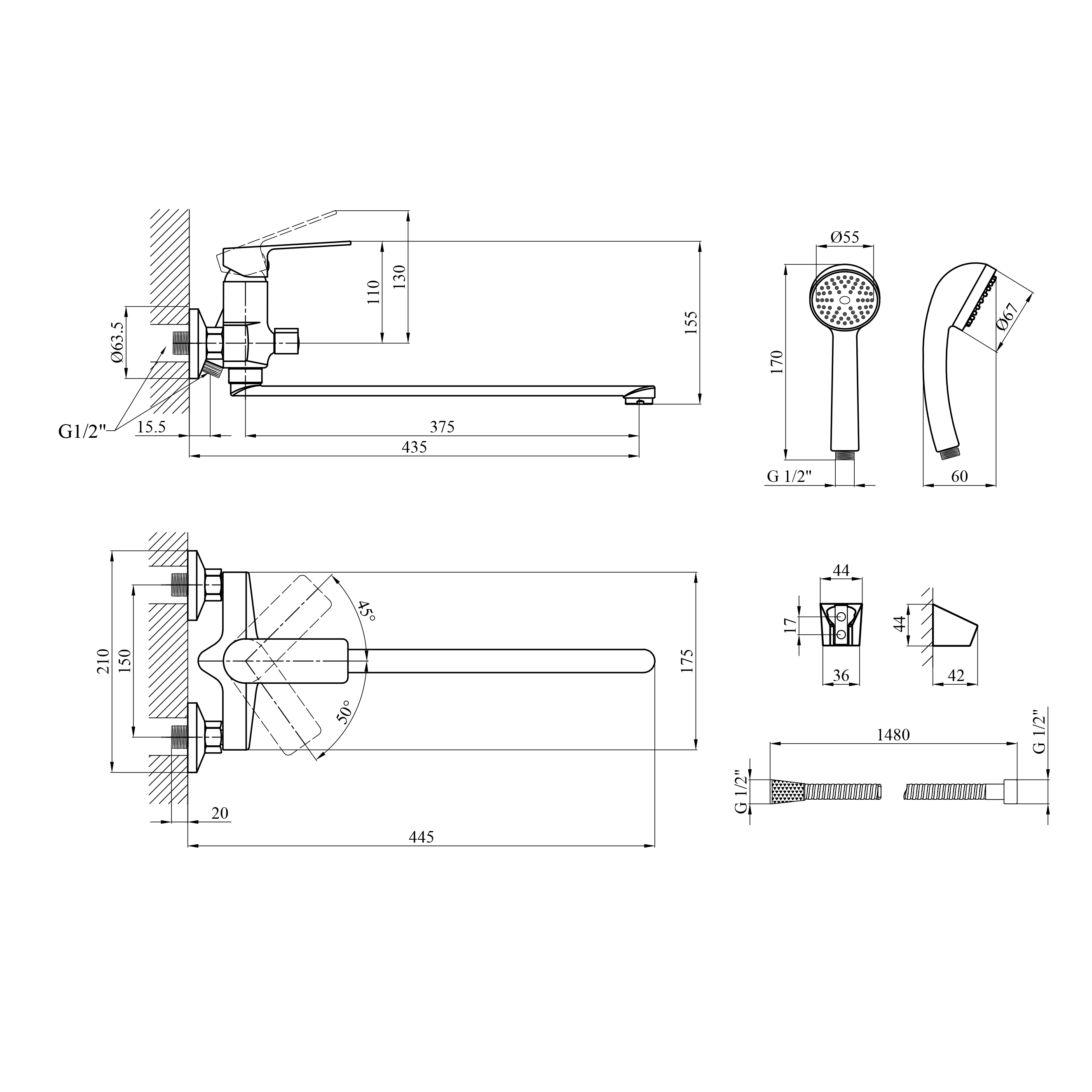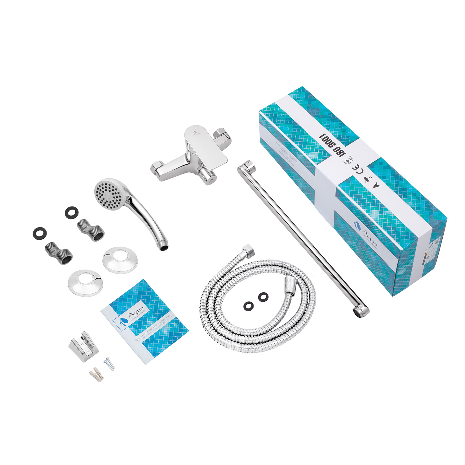 Смеситель, лейка для ручного душа, душевой шланг, кронштейн для ручного душа, крепежи, инструкция.