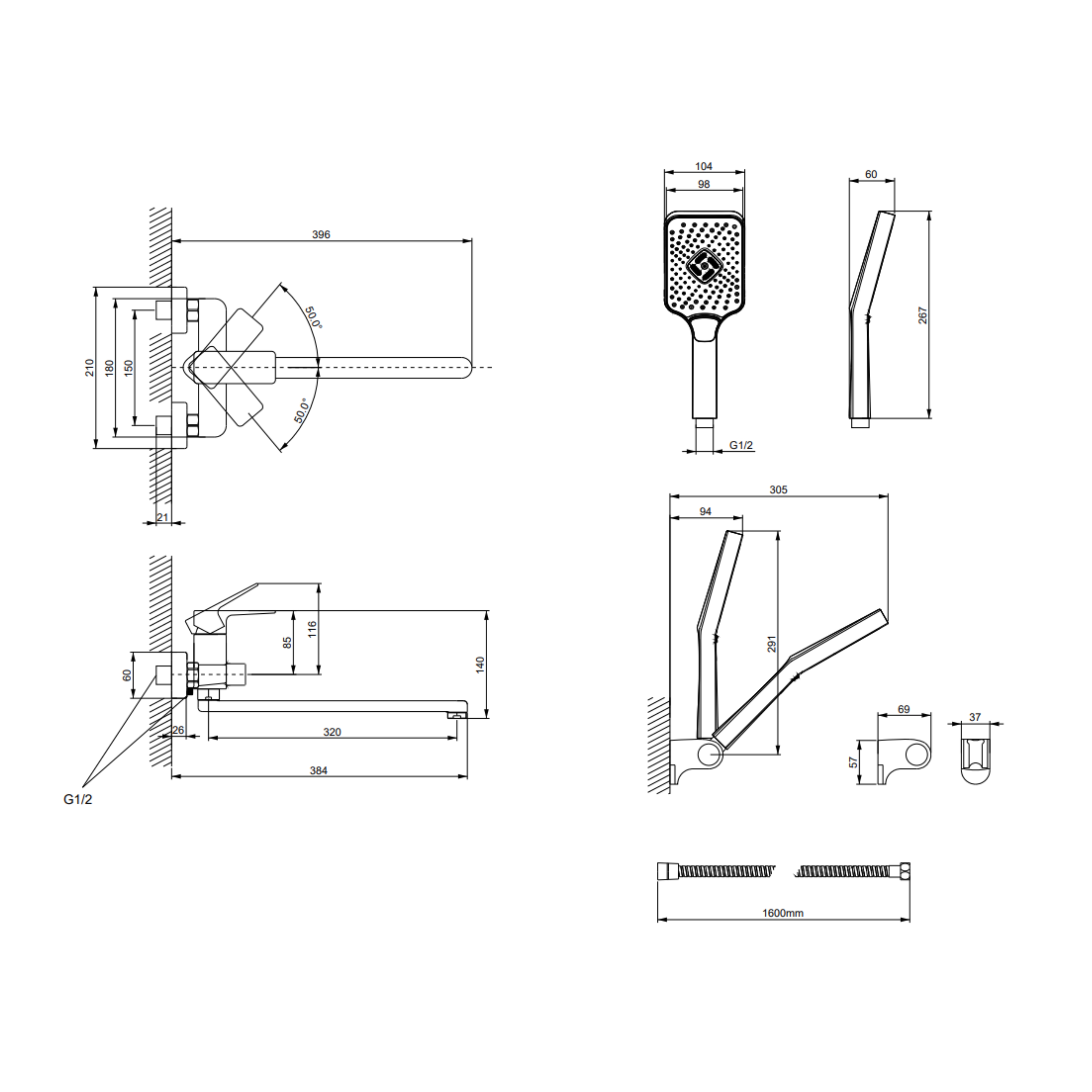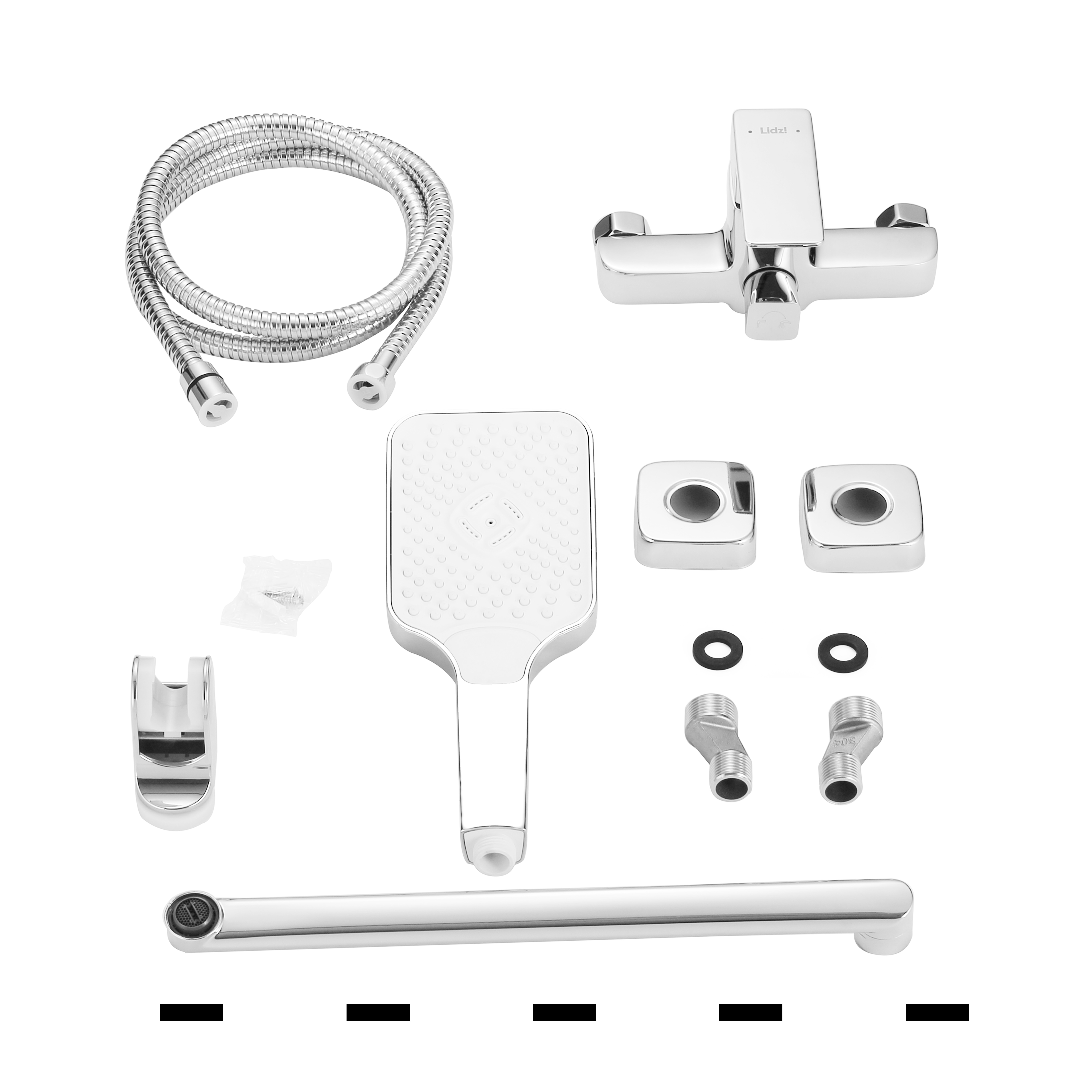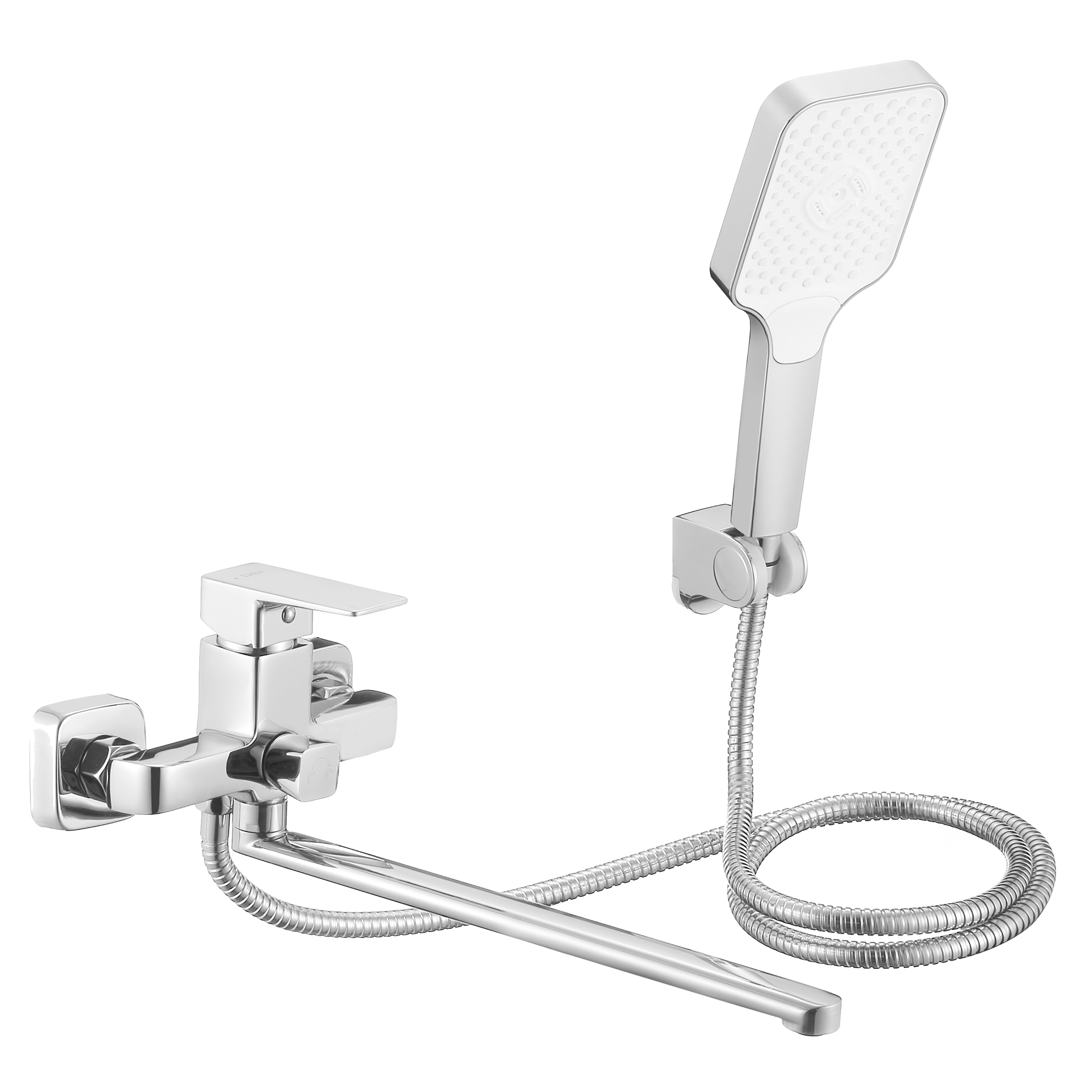 Смеситель, излив, душевой шланг, ручная лейка, декоративные чашки (розетки) - 2 шт, эксцентрики (переходники) - 2 шт, уплотнительные прокладки - 2 шт, держатель для душа, крепёж для держателя.